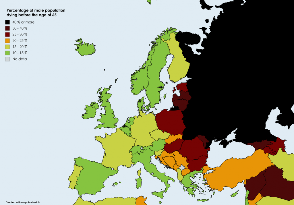Европейские страны с самым высоким уровнем смертности среди мужчин в возрасте до 65 лет: